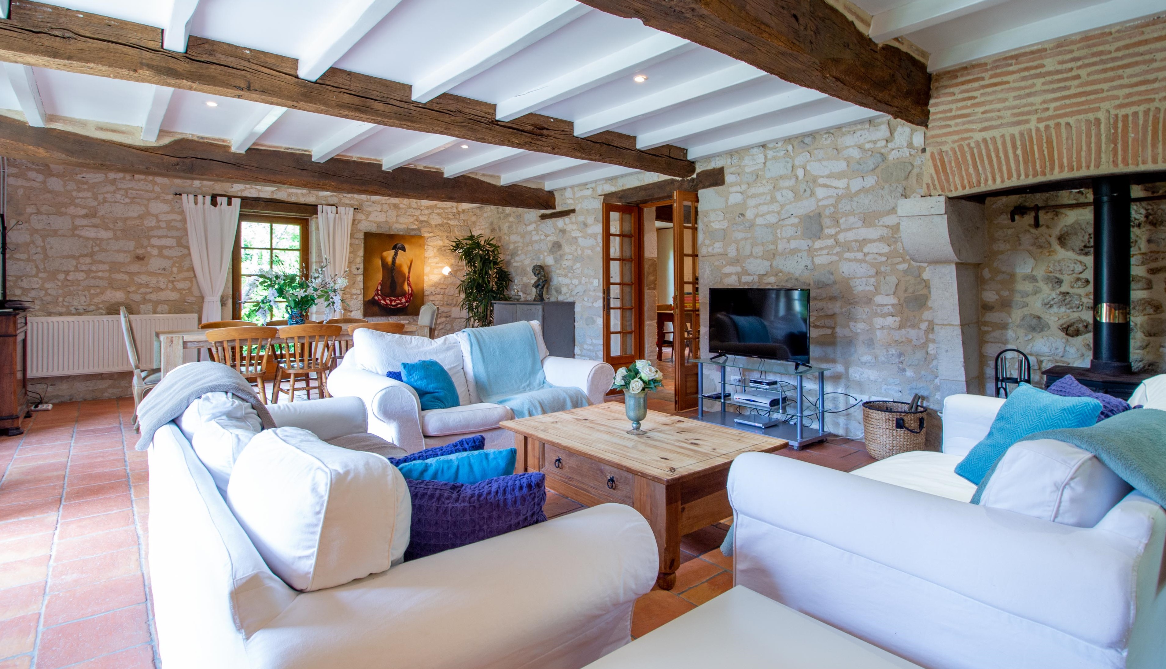 There's a dining table for eight, three sofas, DVD player, television with Freesat and Cahors for French TV. The raised terrace also has a large dining table and an area with more relaxed seating for those evening aperitifs!